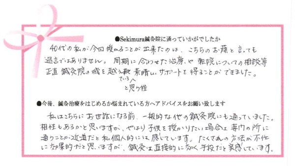 周期に合わせた治療や転院についての相談等、正直、鍼灸院の域を越えていると思う程