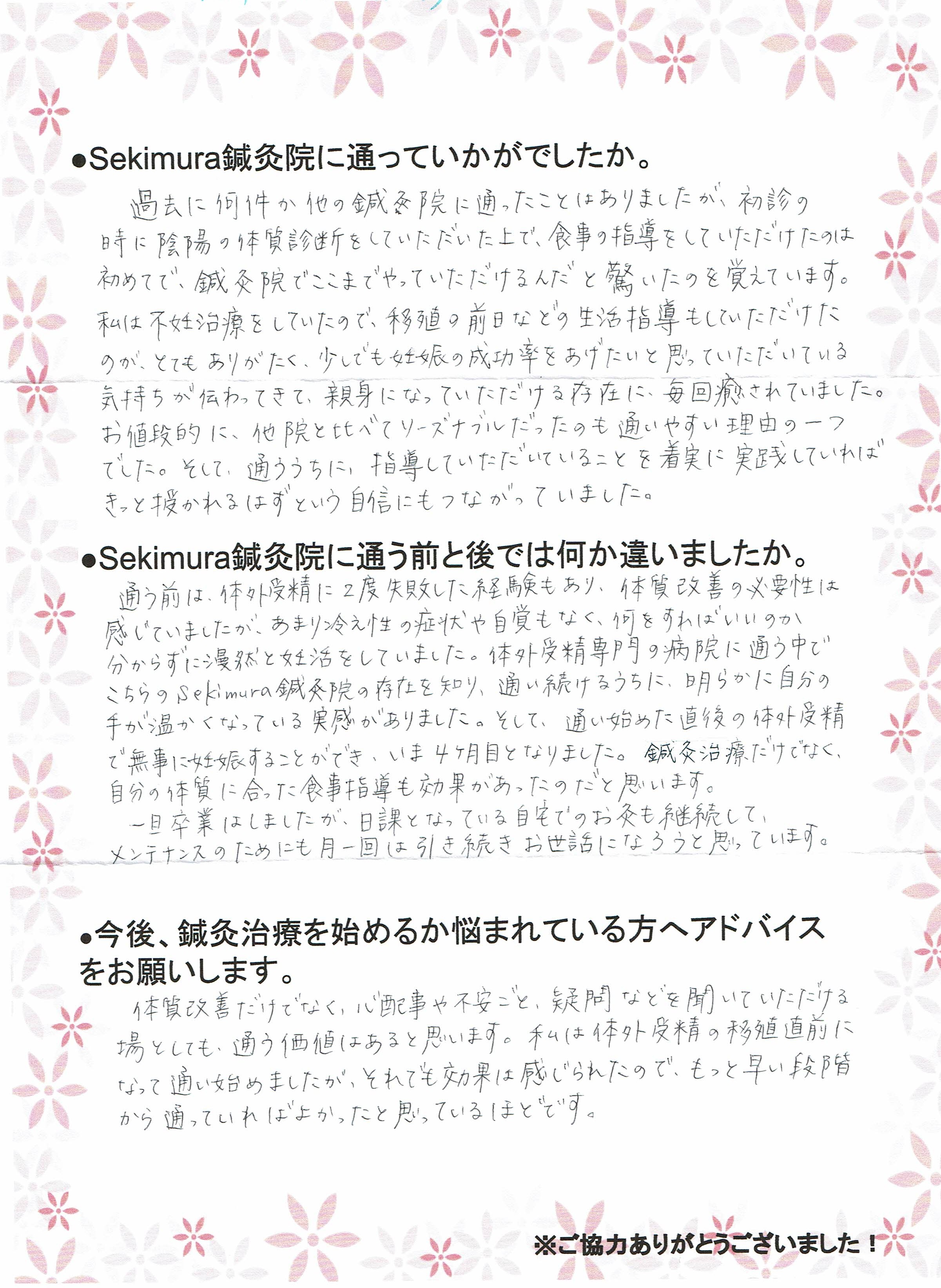 体外受精専門の病院に通う中でこちらのSekimura鍼灸院の存在を知り、通い続けるうちに、明らかに自分の手が温かくなっている実感がありました。